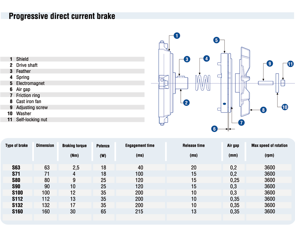 - Wide range of uses. The brake can be used in any application and in any position, particularly in single-phase motors, since moving parts do not vibrate at all.