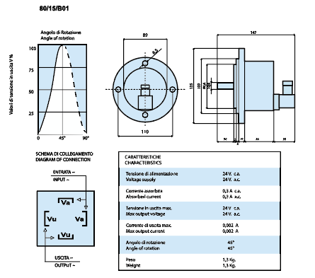 Il se distingue du type 80/15/B01 par ses caractéristiques électriques et mécaniques, alimentation DC (courant continu) à faible ondulation, conçue pour éliminer les perturbations de linéarité du signal de sortie égales à 2% sur toute l’exécution à 90°.